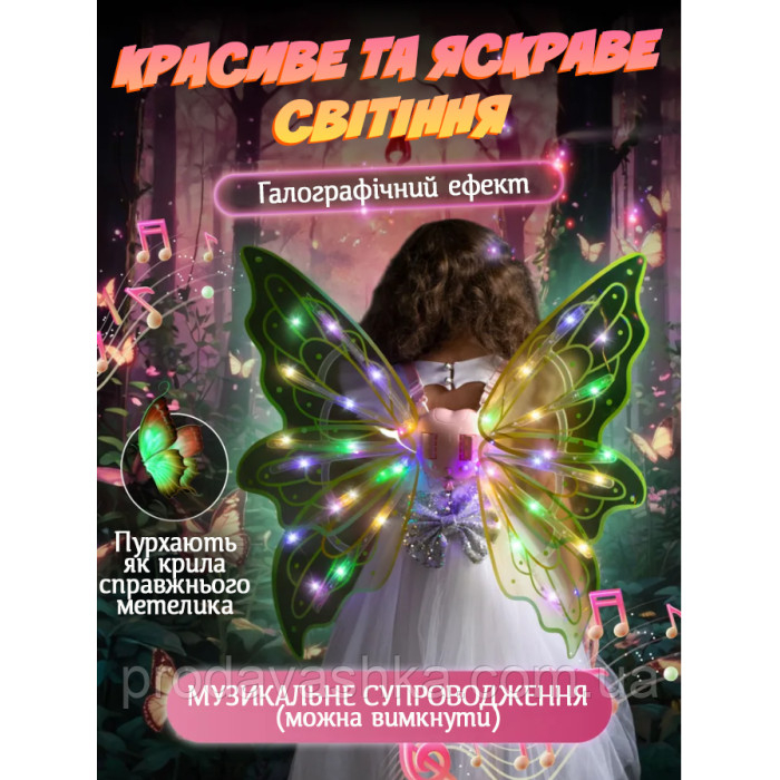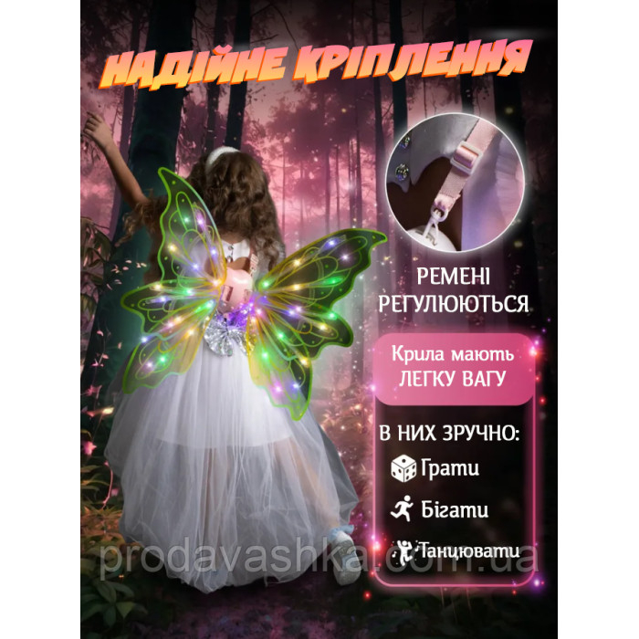 Дитячі крила метелика подарунок для дівчинки феї світлодіодні на лямках з функцією руху та музикою для костюма ЗеленіКрила феї світлодіодне підсвічування, музика на батарейці Wings of Fairie – оригінальні крила для дівчи... Читати далі...