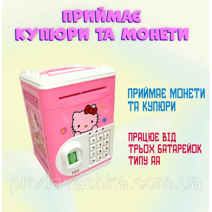 Дитяча електронна скарбничка іграшковий сейф Hello Kitty з відбитком, кодовим замком та купюроприймачем для паперових грошей та монет зі звуковими ефектамиКожна дитина хоче мати власні кошти для покупки іграшок або солод... Читати далі...