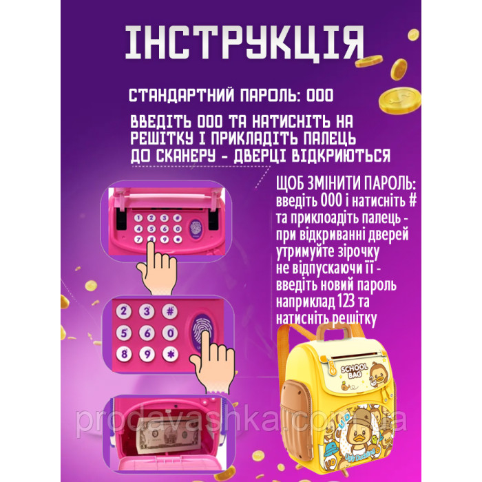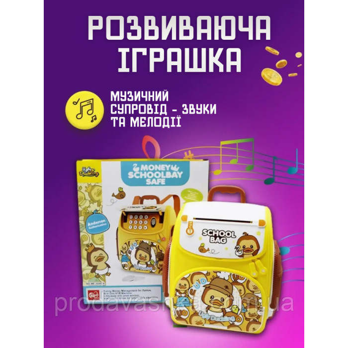 Дитяча електронна скарбничка сейф-рюкзак Каченя з кодовим замком вібдитком пальця купюроприймач для паперових грошей монет ЖовтаКожна дитина хоче мати власні кошти для покупки іграшок або солодощів. Збирати та відкладати... Читати далі...