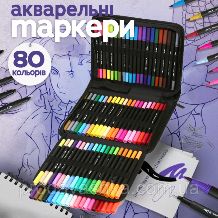 Дитячий набір акварельних маркерів для малювання 80шт двосторонніх фломастерів у сумці для творчості на водній основі художніМаркер - досить "молодий" інструмент у графіку. Маркерами працюють дизайнери та модельєри, архі... Читати далі...