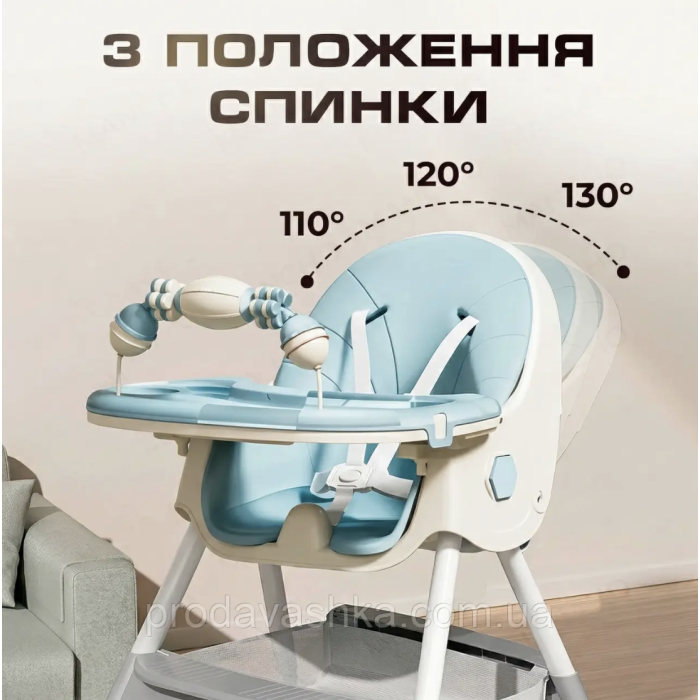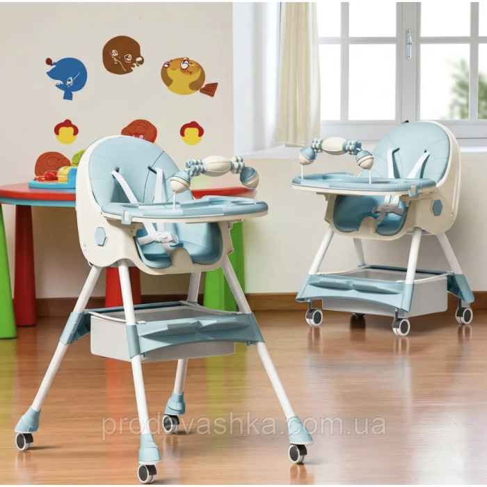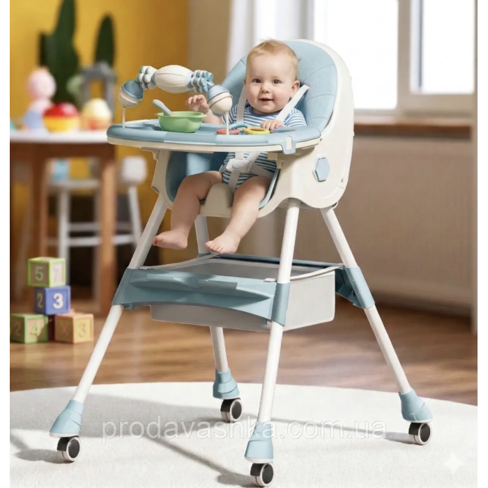 Дитячий стільчик трансформер 2в1 для годування дітей з регульованою спиною та висотою на коліщатках з іграшками Блакитний