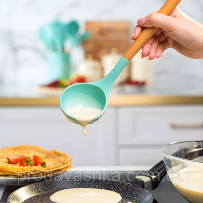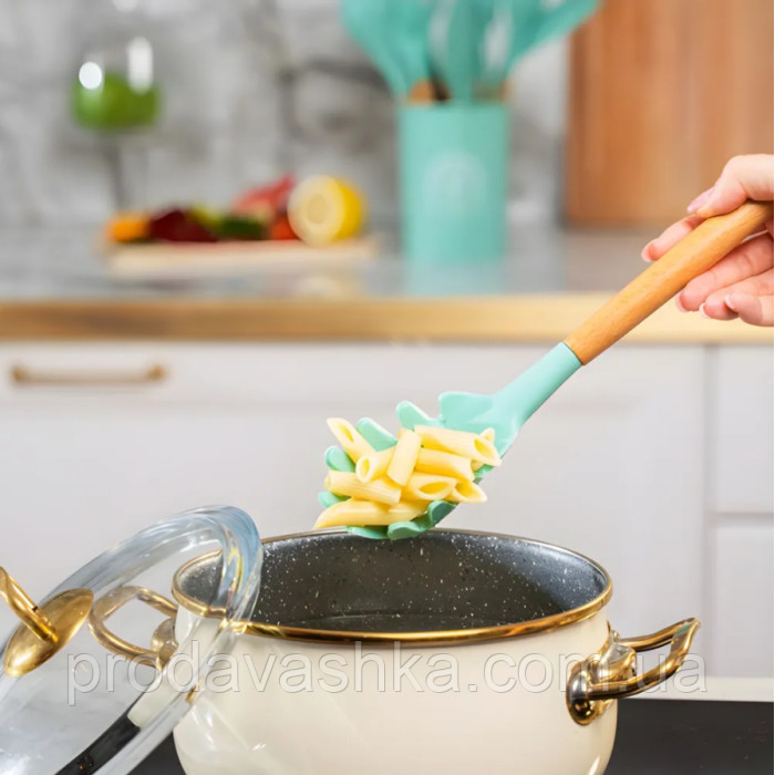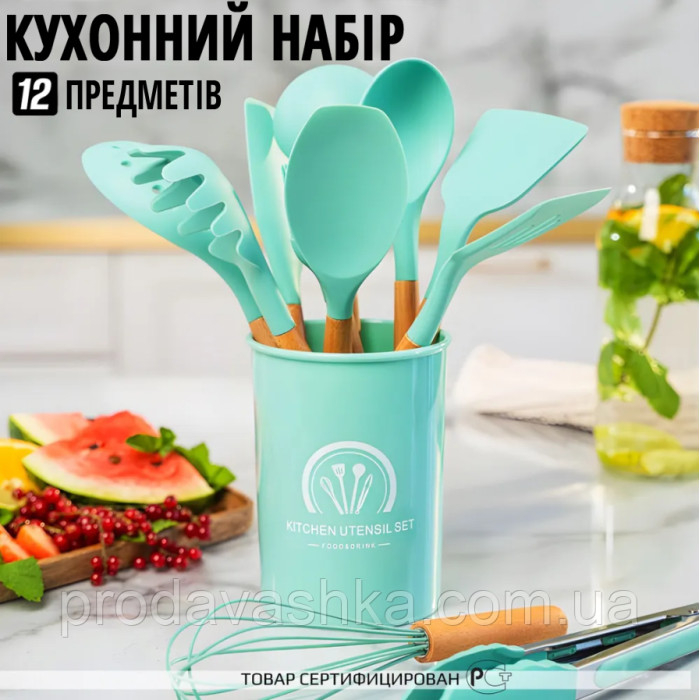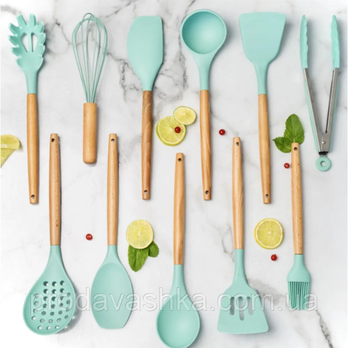 Комплект 12 предметів кухонного силіконового приладдя набір приладів з дерев'яною ручкою на підставці лопатки начиння для кухні БлакитнийНабір кухонного приладдя 12 предметів - це незамінний помічник для будь-якої господ... Читати далі...