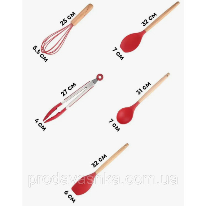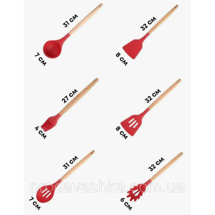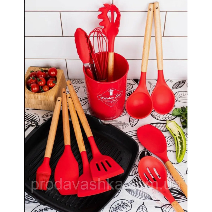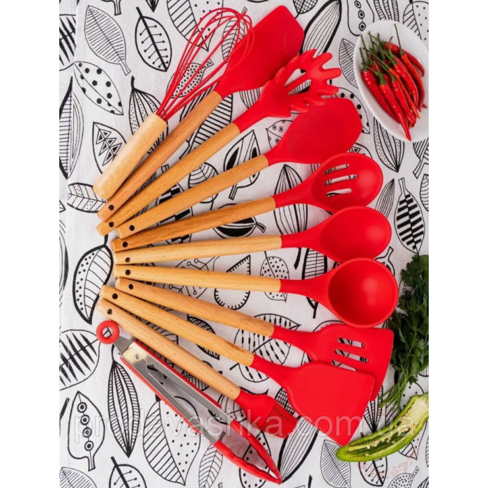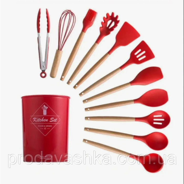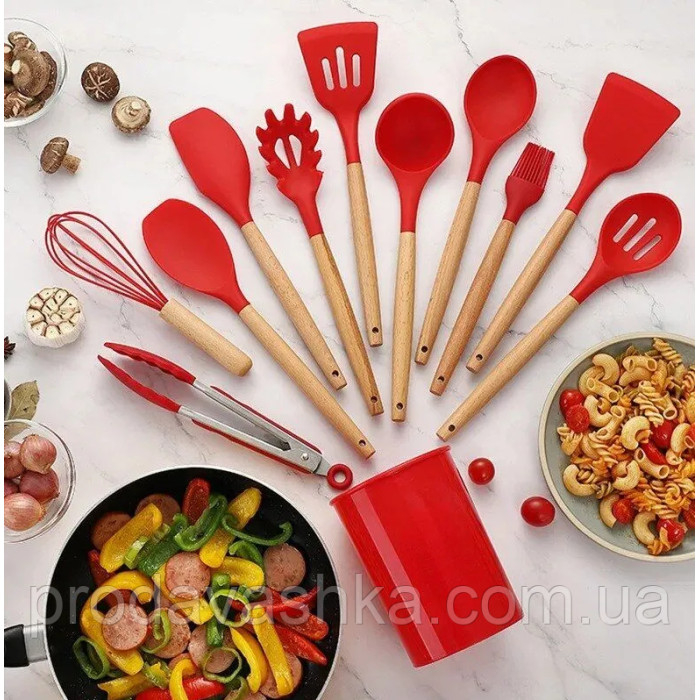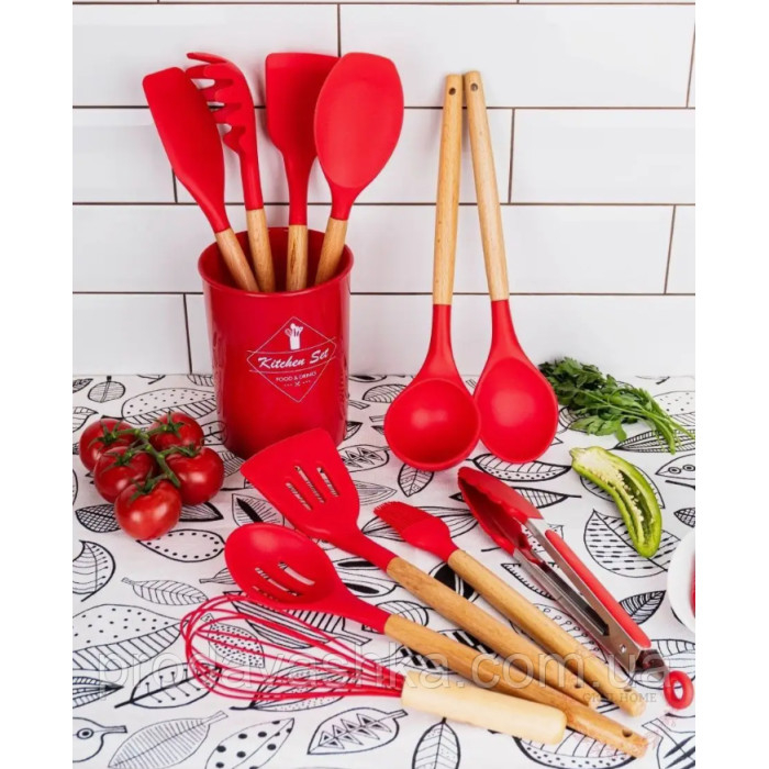 Комплект 12 предметів кухонного силіконового приладдя набір приладів з дерев'яною ручкою на підставці лопатки начиння для кухні Червоний