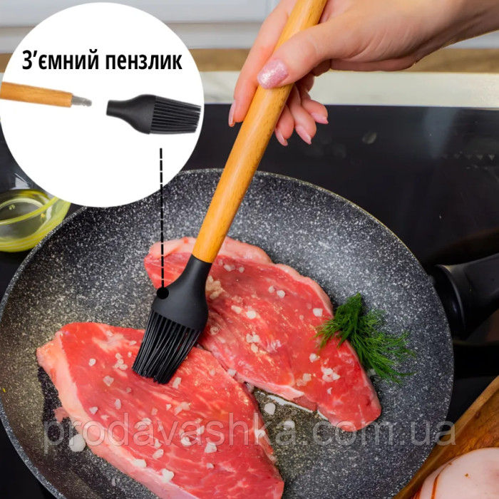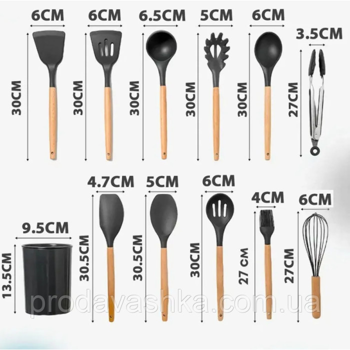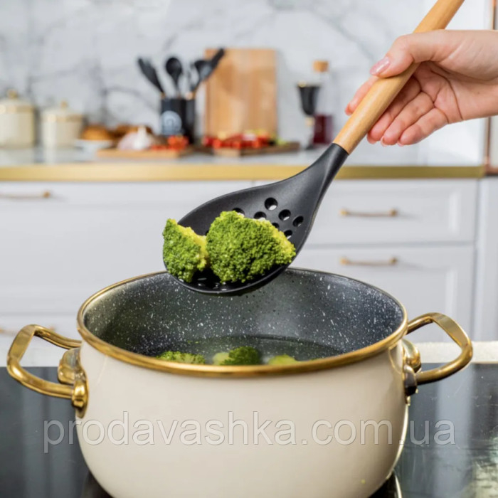 Комплект 12 предметів кухонного силіконового приладдя набір приладів з дерев'яною ручкою на підставці лопатки начиння для кухні ЧорнийНабір кухонного приладдя 12 предметів - це незамінний помічник для будь-якої господині... Читати далі...
