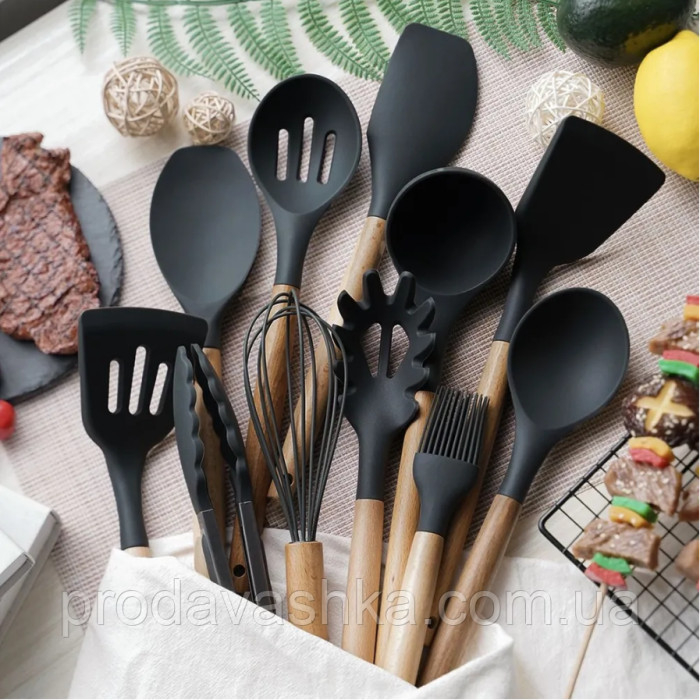 Комплект 12 предметів кухонного силіконового приладдя набір приладів з дерев'яною ручкою на підставці лопатки начиння для кухні Чорний