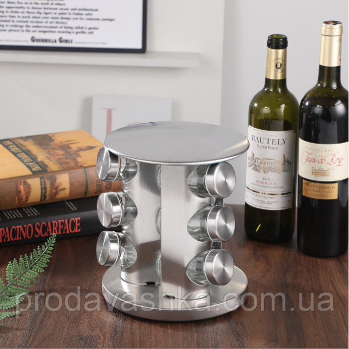 Підставка для спецій виготовлена з нержавіючої сталі та може обертатися по колу, що дуже зручно та практично. Ємності виконані зі скла, а кришки до них – із нержавіючої сталі.