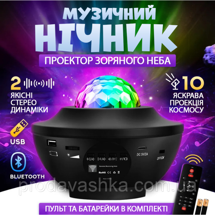 Музичний нічник зоряне небо проектор зірок лазерний світильник галактика з блютуз колонкою та пультом дитячий ЮСБ