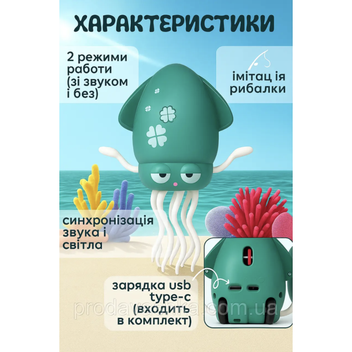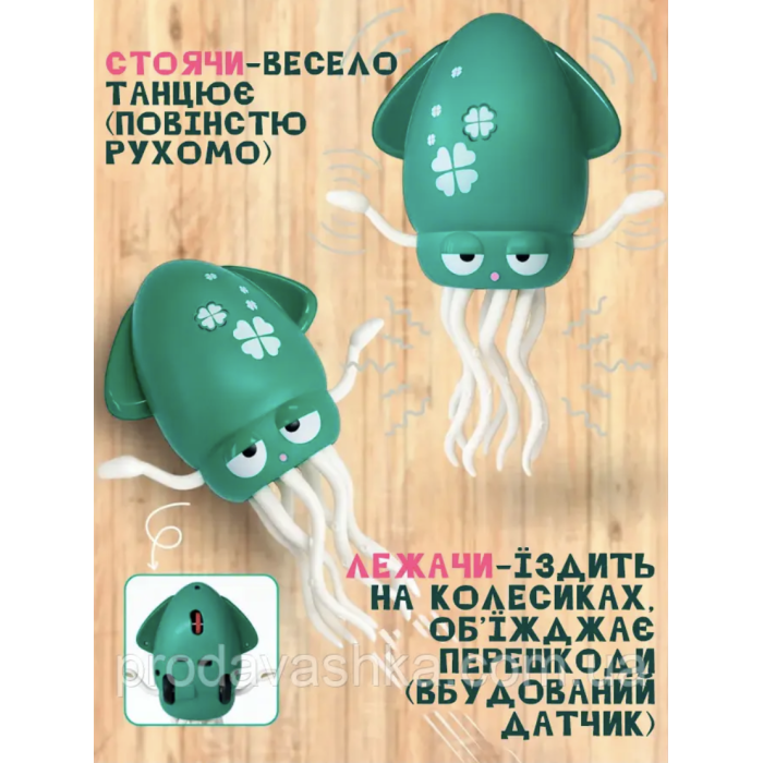 Весела інтерактивна іграшка у вигляді восьминога стане улюбленцем кожної дитини. Іграшка вміє танцювати, рухатися в різні боки, об'їжджати перешкоди та супроводжує гру веселою музикою. Завдяки вбудованому сенсору розпізнавання об'єктів, восьминіг не стикається з меблями чи стінами, а змінює напрямок руху. Працює від акумулятора, який заряджається через USB, що робить його зручним у використанні.
