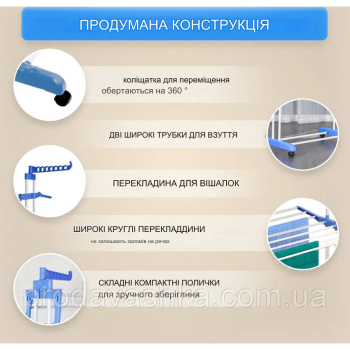 - Сушарка має 4 колеса, тому Ви з легкістю зможете пересувати її у будь-яке приміщення у завантаженому вигляді.