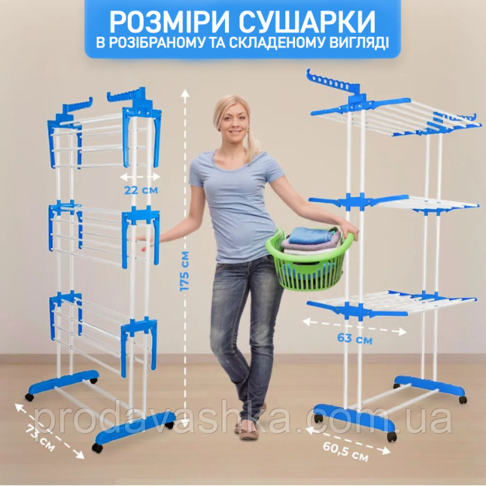 - Розміри сушарки: 175 см х 73 см х 60,5 див; (полички розкладаються до 63 см)