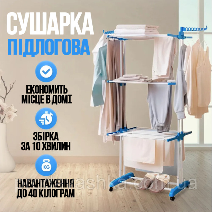 Вертикальна сушарка для білизни на три яруси Three Layers Cloth Rack - висушить одяг, значно заощадивши простір у квартирі та гроші в сімейному бюджеті. Ця сушарка чудово увійде до малогабаритної квартири, при тому що вміщує великий обсяг одягу!