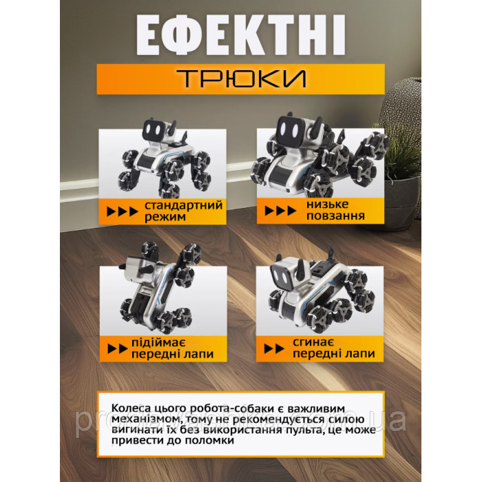 - Приголомшливі трюки: Robotdog обладнаний шинами McNamee stunt, що дають змогу йому виконувати запаморочливі трюки. Він стійкий до падінь і зношування, що робить його ідеальною іграшкою для активних ігор.