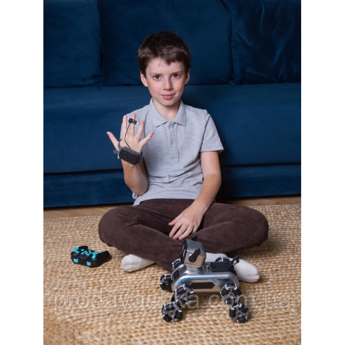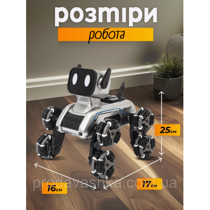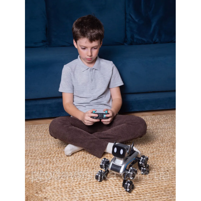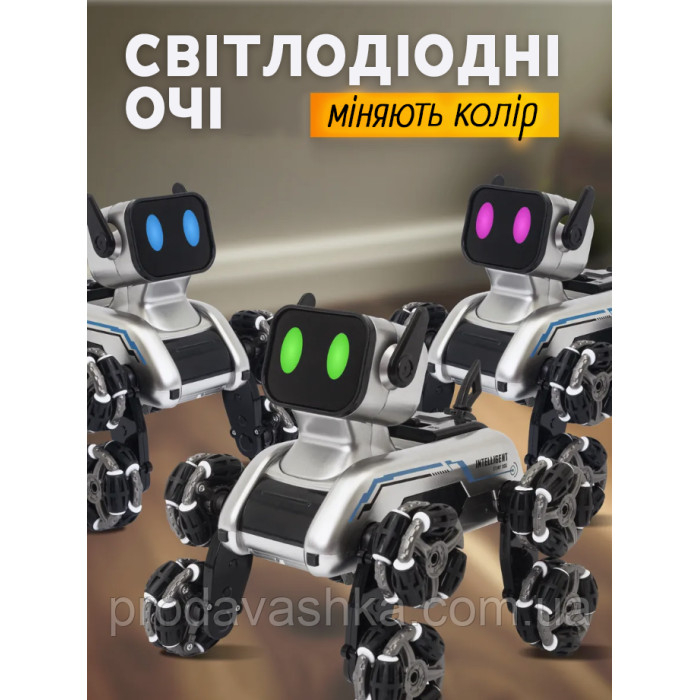 Робопес на восьми колесах — це інноваційна іграшка для юних шанувальників техніки та робототехніки. Завдяки сучасному дизайну та функціональності, цей чотирилапий друг виконує дивовижні трюки, рухається в різних напрямках і має LED-підсвітку, яка робить гру ще цікавішою. Керування відбувається за допомогою пульта дистанційного керування або спеціального контролера на руці, що реагує на рухи, що надає інтерактивності.
