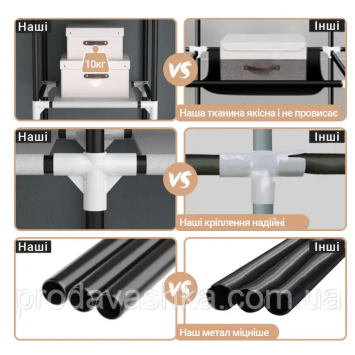 Шафа тканинна складана стійка, але при необхідності її можна швидко розібрати і перемістити на нове місце. Збірна шафа стане незамінною, якщо Ви винаймаєте квартиру, живете в гуртожитку або часто переїжджаєте.