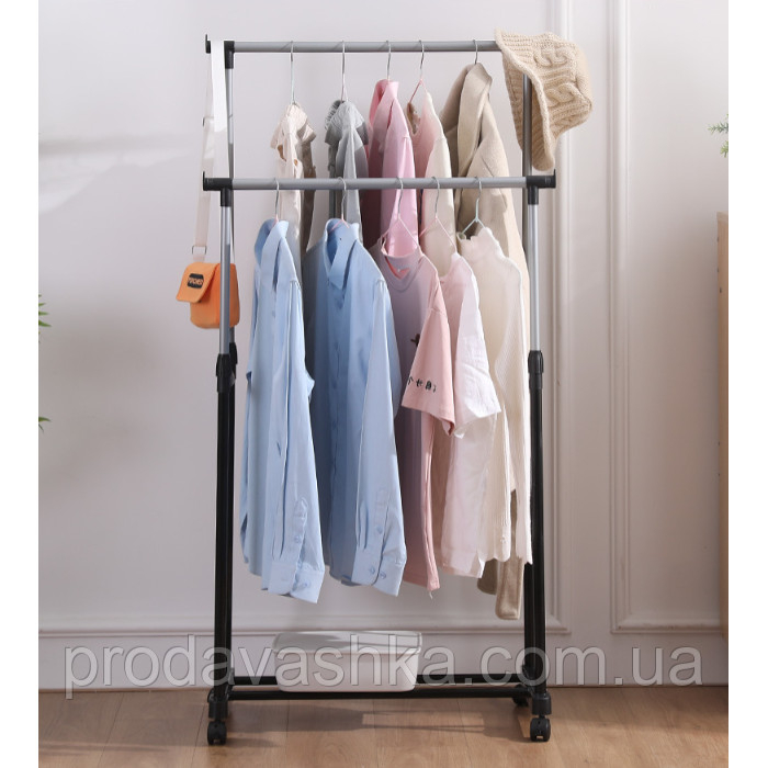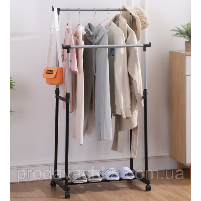 Стійка для одягу на дві поперечини. Два рейлінги в основі стійки для одягу є підставкою для взуття. Вішалка пересувається коліщатками. Класична пересувна стійка для одягу виправдано користується великою популярністю - це зумовлено поєднанням її естетичного вигляду із зручністю та практичністю. Стійка для одягу на дві поперечини широко застосовується і чудово виглядає як в житлових приміщеннях, так і в офісах, на дачах і т.д.